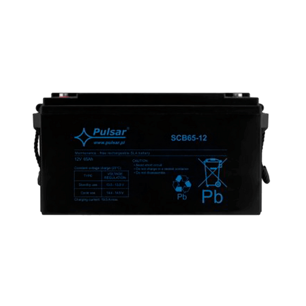 SCB batteries are maintenance-free Valve Regulated Lead Acid Batteries with self-regulating one-sided safety valves and internal gas recombination. The batteries are made in AGM (Absorbent Glass Mat) technology; the electrolyte is held in the glass mat. The technology used allows installing batteries in places with natural (gravity) ventilation and minimizes maintenance. They are dedicated for devices requiring emergency power to a load when the input power source or mains power fails, such as: buffer power supplies used, among others, in CCTV systems, alarm systems (Intrusion Detection Systems, IDS), and access control systems (ACS), UPS units, etc... Nominal voltage: 12 VDC. Nominal capacity: 65 Ah. Projected lifespan: 3 to 5 years at 20°C. Charging current: Recommended 6.5 Amp, Maximum 19.5 Amp. Dimensions: W = 349 , H = 178 , D = 167 [mm, +/-2].