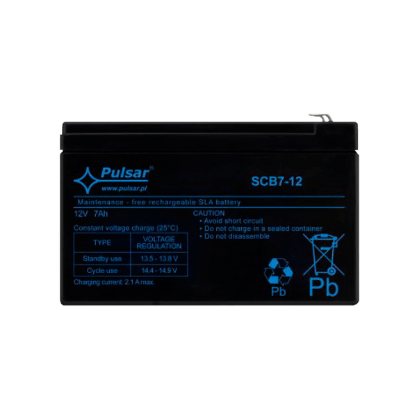 SCB batteries are maintenance-free Valve Regulated Lead Acid Batteries with self-regulating one-sided safety valves and internal gas recombination. The batteries are made in AGM (Absorbent Glass Mat) technology; the electrolyte is held in the glass mat. The technology used allows installing batteries in places with natural (gravity) ventilation and minimizes maintenance. They are dedicated for devices requiring emergency power to a load when the input power source or mains power fails, such as: buffer power supplies used, among others, in CCTV systems, alarm systems (Intrusion Detection Systems, IDS), and access control systems (ACS), UPS units, etc... Nominal voltage: 12 VDC. Nominal capacity: 7 Ah. Projected lifespan: 2 to 3 years at 20°C. Charging current: Recommended 0.7 Amp, Maximum 2.1 Amp. Dimensions: W = 152 , H = 100 , D = 65 [mm, +/-2].