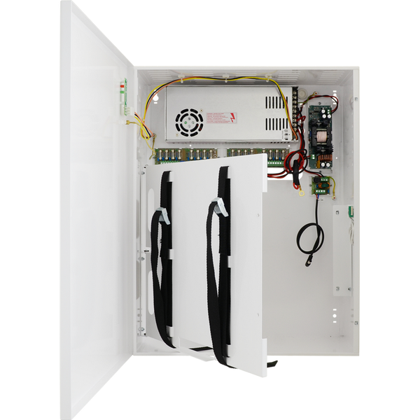 Switch mode buffer power supply units for HD cameras 13.8VDC and recorder 12VDC, and recorder space. Size: 425 x 535 x 190+14 mm. ?I=11A (8x0.75A/13.8VDC + 1x4A/12VDC). Recorder space: 380 x 335 x 80 mm. Tamper:1xNC, 17Ah-UVP (battery protection).